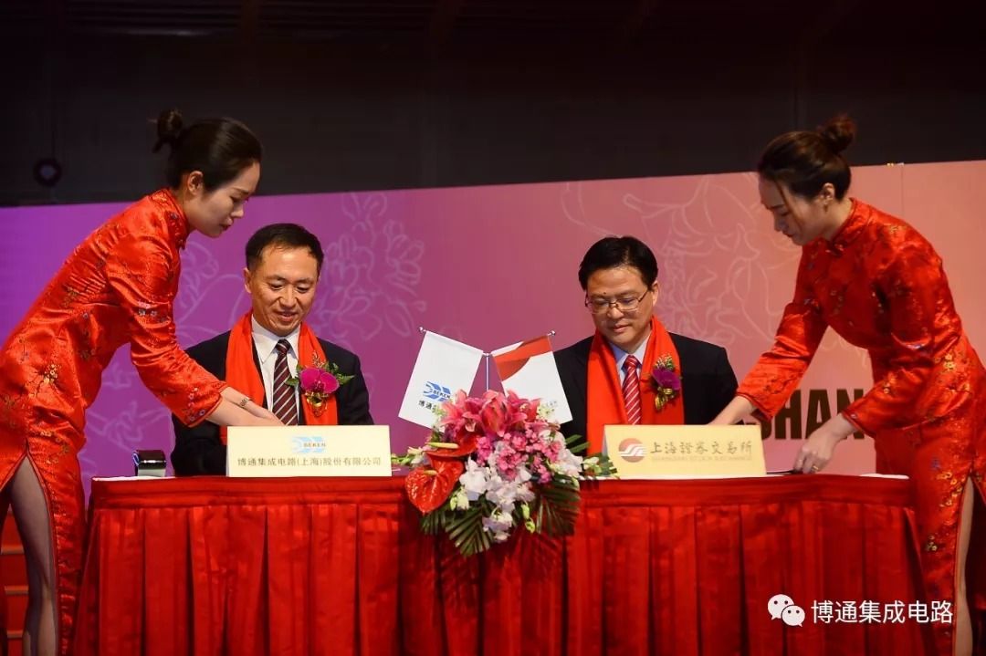 [Xu Yilin (right), Deputy General Manager of the Shanghai Stock Exchange, and Zhang Pengfei (left), Chairman of the Beken Corpration, signed a listing agreement].